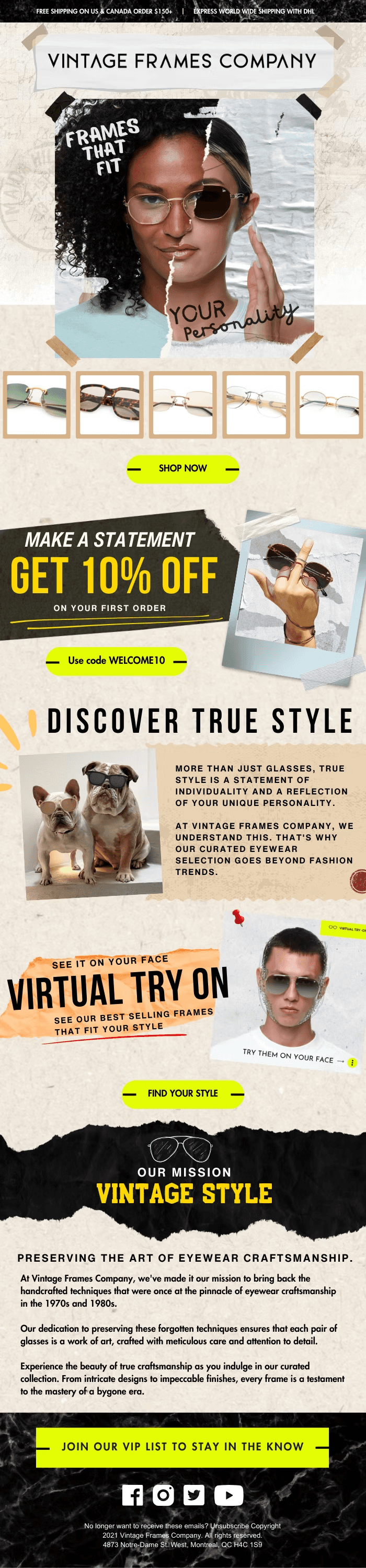From the collage-style visuals to the emotionally intelligent copy, every detail reinforced the Vintage Frames mission: style with substance, fashion with roots. It wasn’t just a welcome email; it was an identity statement.